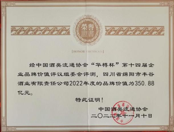 2022年華樽杯評(píng)估豐谷酒業(yè)全年實(shí)現(xiàn)品牌價(jià)值350.88億元